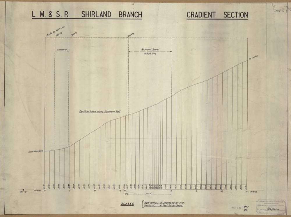 This beautifully colour washed plan is undated but based on its content has to be later than 1887 but earlier than 1910. It has survived in use by the British Rail Property Board until the 1950s. The Midland Railway created their own two chains to the inch land plan of this area (which can be downloaded here for comparison), as did the Great Northern Railway. In the latter case, this is part of a set of plans for their “Derbyshire Extension” which are held by the National Archives under their reference RAIL236/1017. Having compared the two, it is inescapable that the NSR version is identical to that of the Great Northern's except for the 'branding' in the top right corner — which will undoubtedly make for an interesting story.