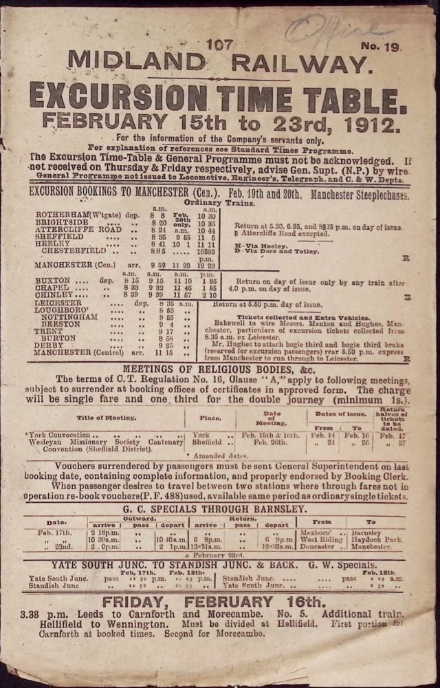 As a project resulting from our Partners in Excellence collaboration with the National Railway Museum we are delighted to announce the availability of a Finding Aid for Midland Railway Timetables. This document details all known examples of Public and Working Timetables held by ourselves, the NRM and the National Archives at Kew. Thanks to the work of David Geldard in particular, we hope this will be a really useful guide for researchers.